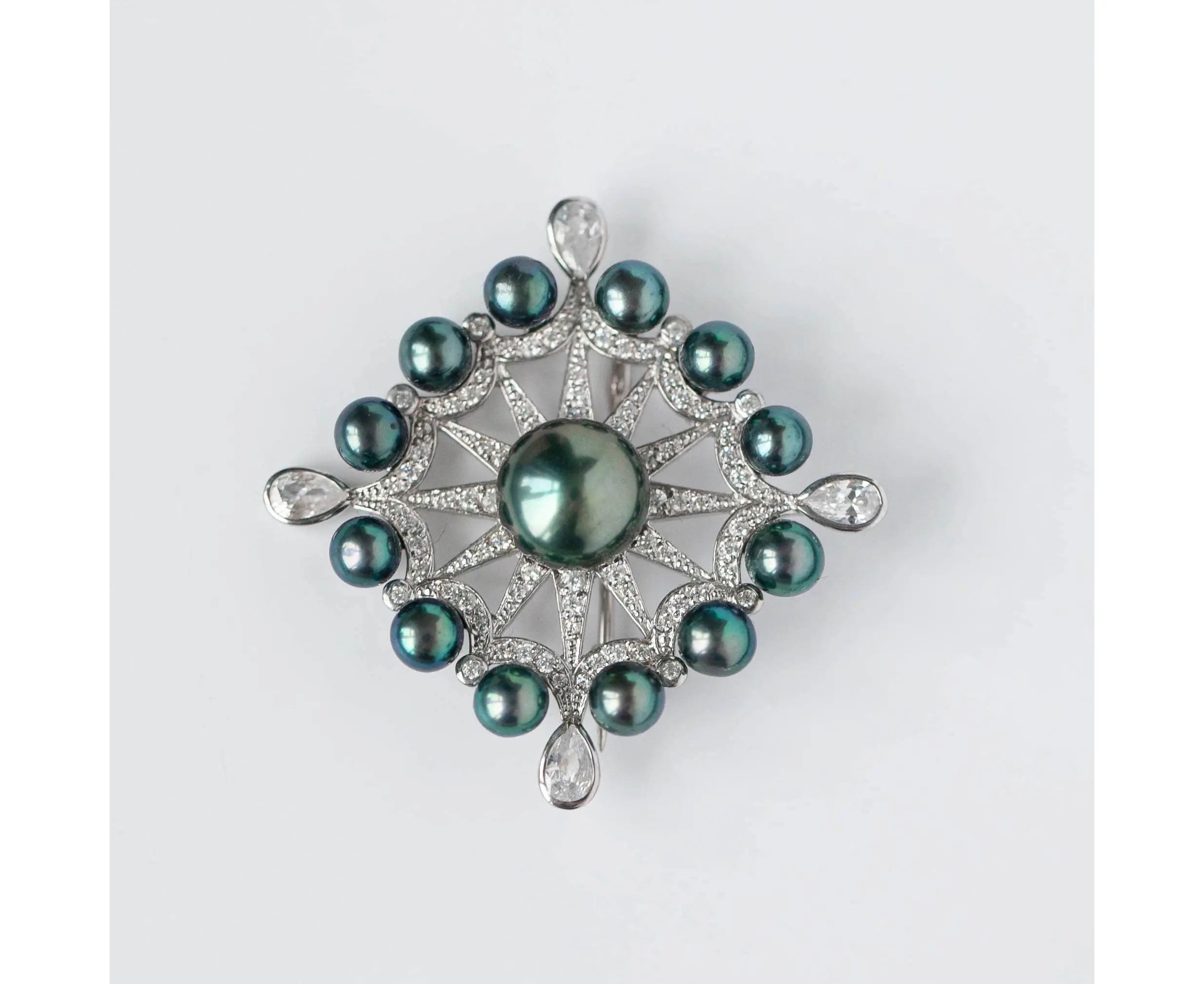 Брошь ромб в серебре с крупной жемчужиной (12 пр.жемч. 4-5 мм, 1 пр.жемч. 9-10мм, 72 кр.фианита Ag 6,7 гр)