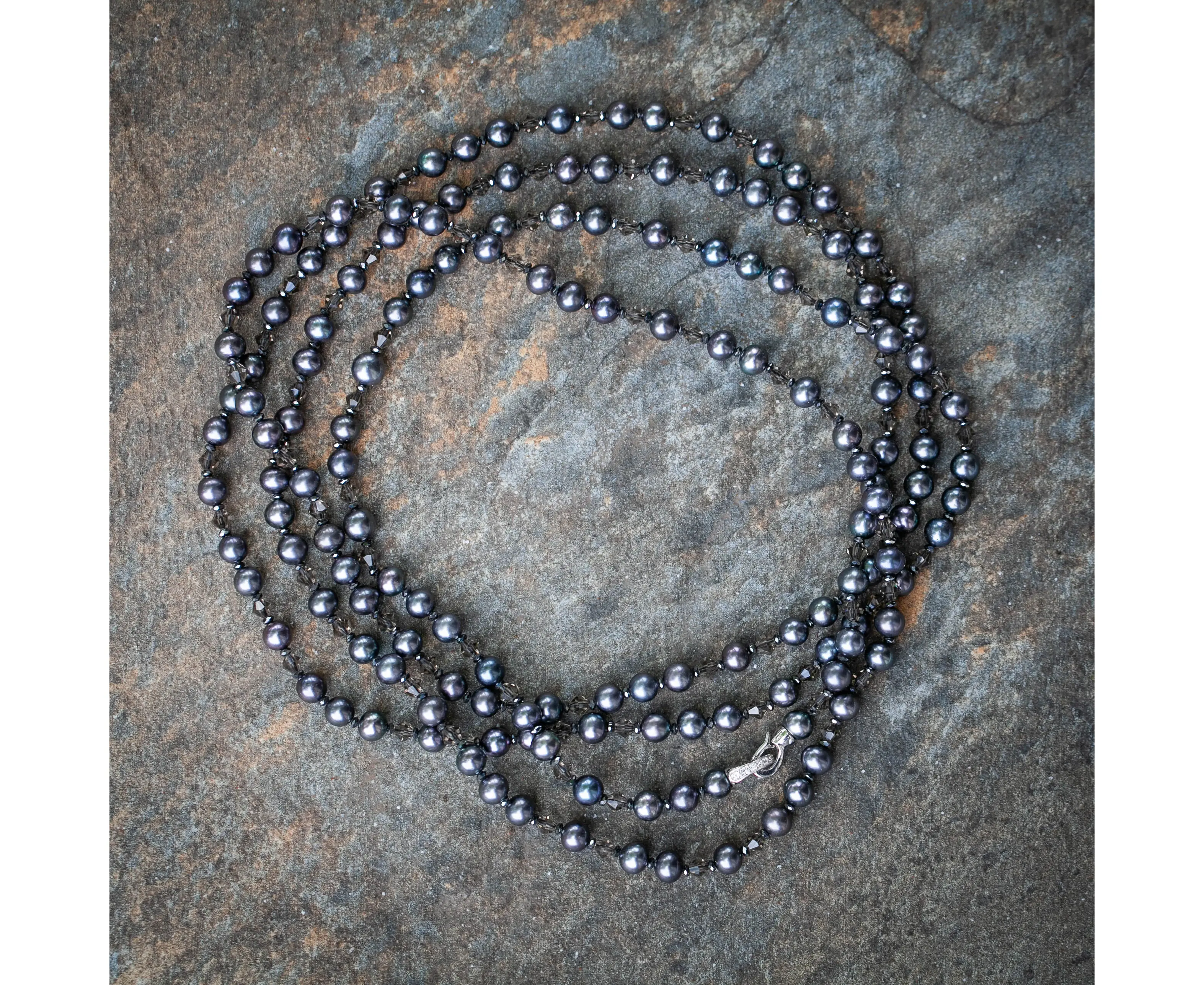 Нить намотка из темного жемчуга 6мм, марказита,бусин Swarovski, в золоте с бесцветными сапфирами (пр.жемчуг 6-6,5 мм, марказит юв.огр 2 мм,бусины Swarovski , Au - 1,39 гр, 14 бесцв.сапфиры)