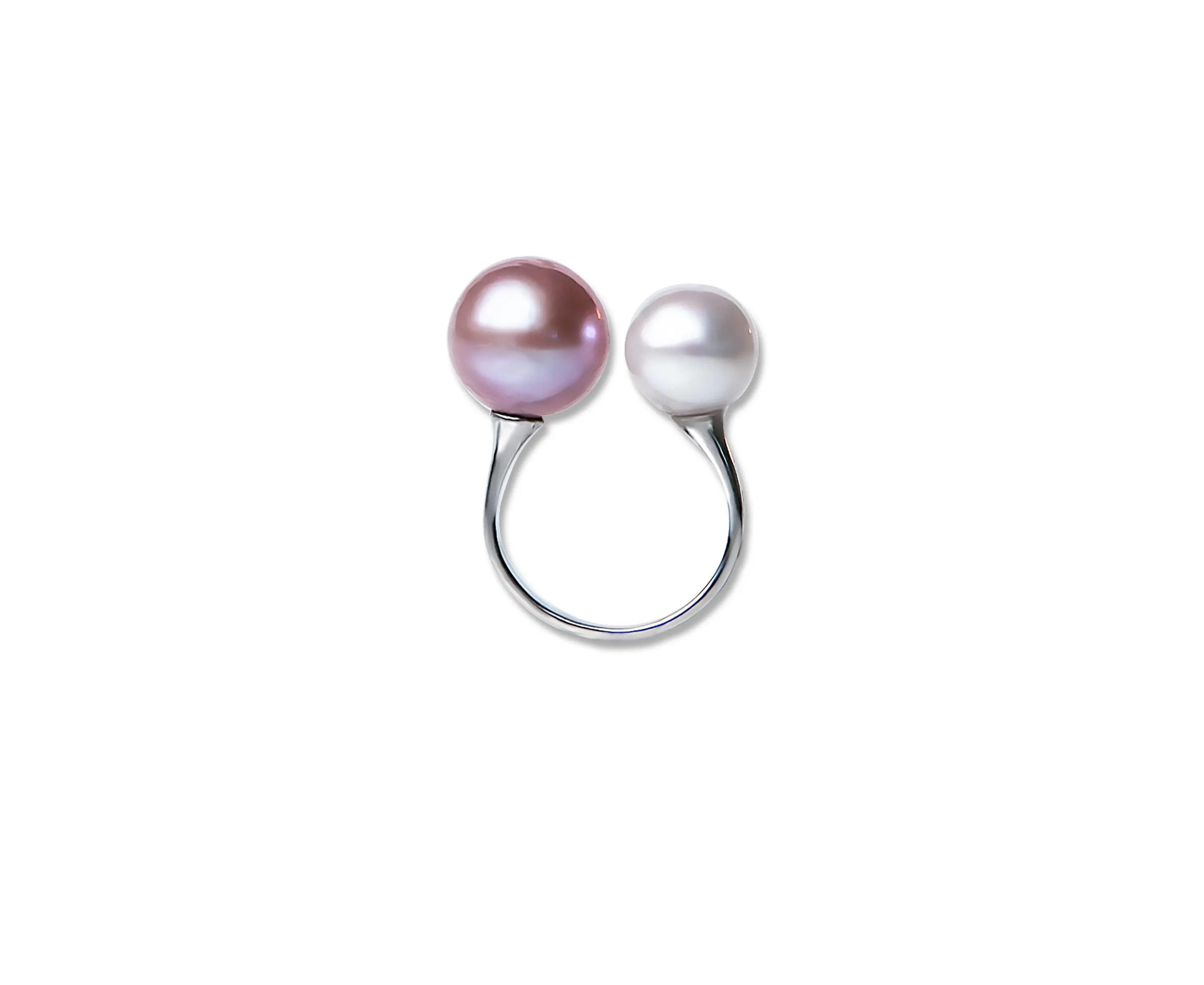 Кольцо-поцелуйчик в белом золоте с белой жемчужиной 9 мм и цветной жемчужиной 12 мм