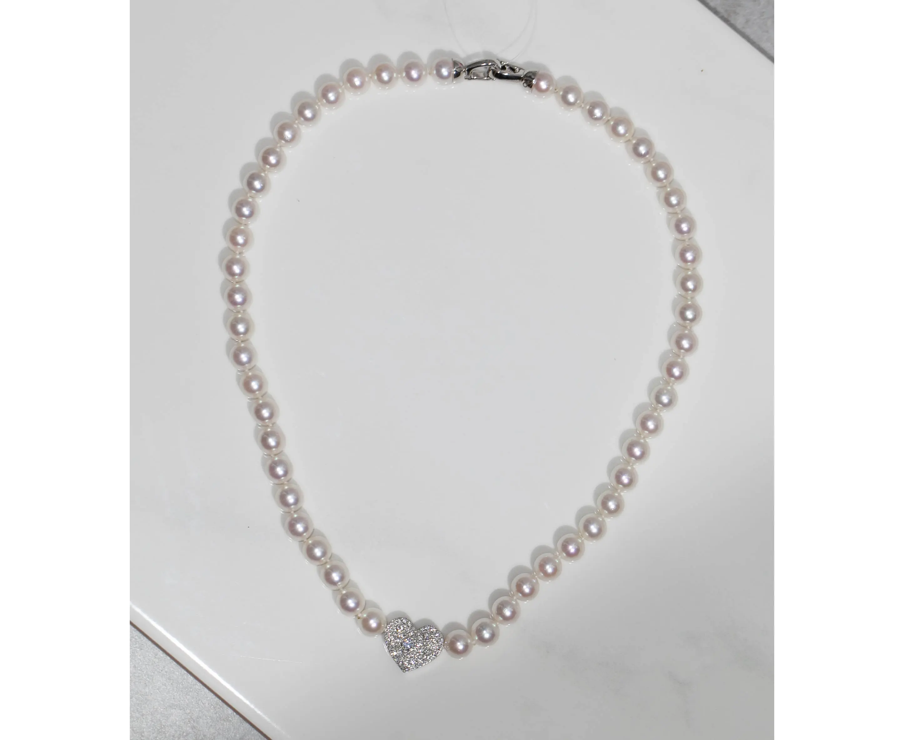 Колье "Сердце мамы"в белом золоте, жемчуг Акоя 8мм с топазами, бесцветными сафпирами (Жемчуг Акоя 8 мм, топаз кр. 4,0-1; 2,25-4; 1,5-32; 1,0-6; 0,9-10; бесцв. сапфир 1,0-12; Au - 8,35 гр)