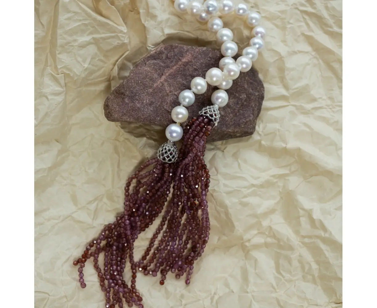 Лариат в серебре из белого жемчуга с кистями из турмалина 130 см (пр. жемчуг 6-7 мм, турмалин 2 мм)