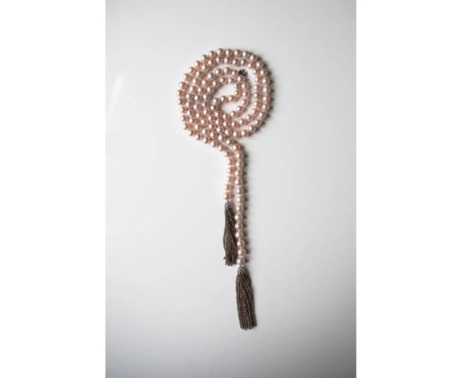 Лариат из розового жемчуга d 7 мм. и кистями из раухтопаза (жемчуг пр. 7 мм, раухтопаз 2 мм, Ag 3.4 гр)