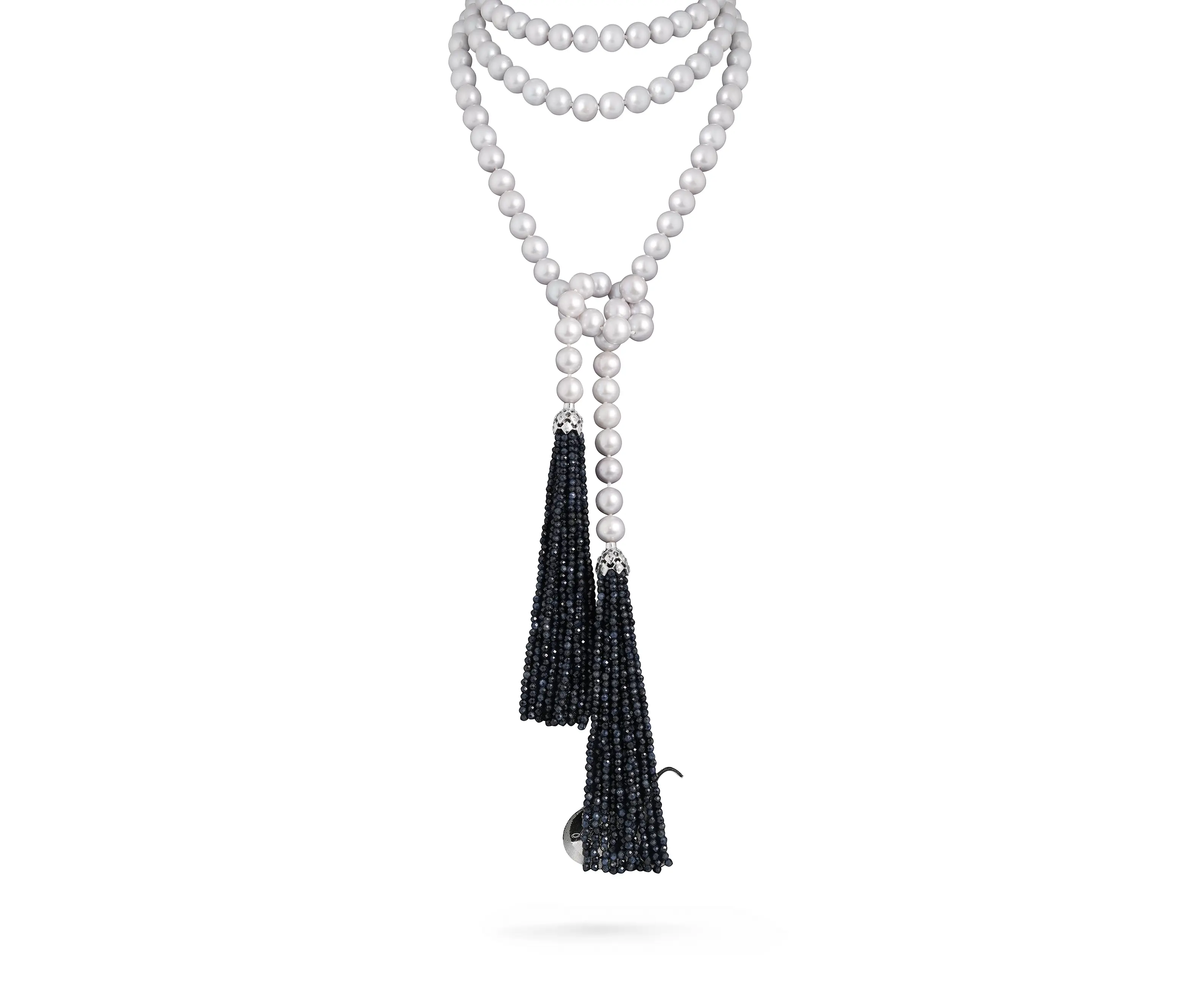 Лариат из жемчуга 6-7мм с кистями из шпинели, белое золото (пр.жемчуг 6-7мм, шпинель 2мм; бесцв.сапфиры 0,9-24, Au 4,46 г)