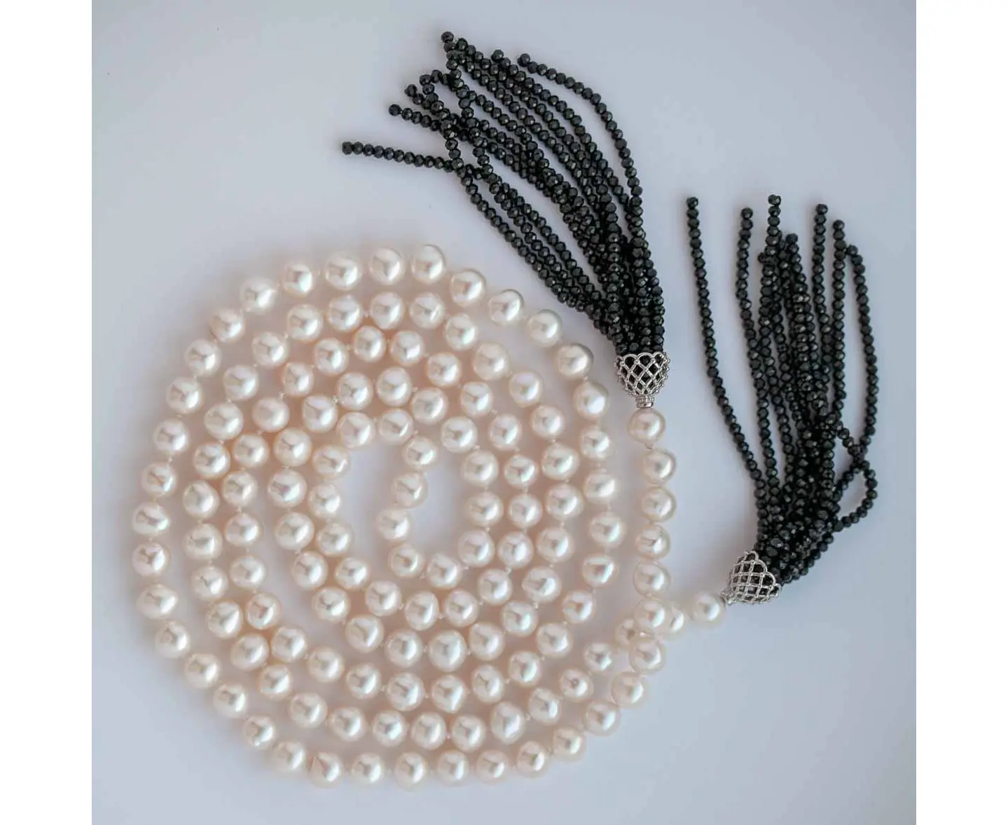 Лариат в серебре LL из белого жемчуга с кистями из шпинели 100 см (Жемчуг 5-6 мм, Шпинель 2 мм, Ag 925- 1,4 гр)