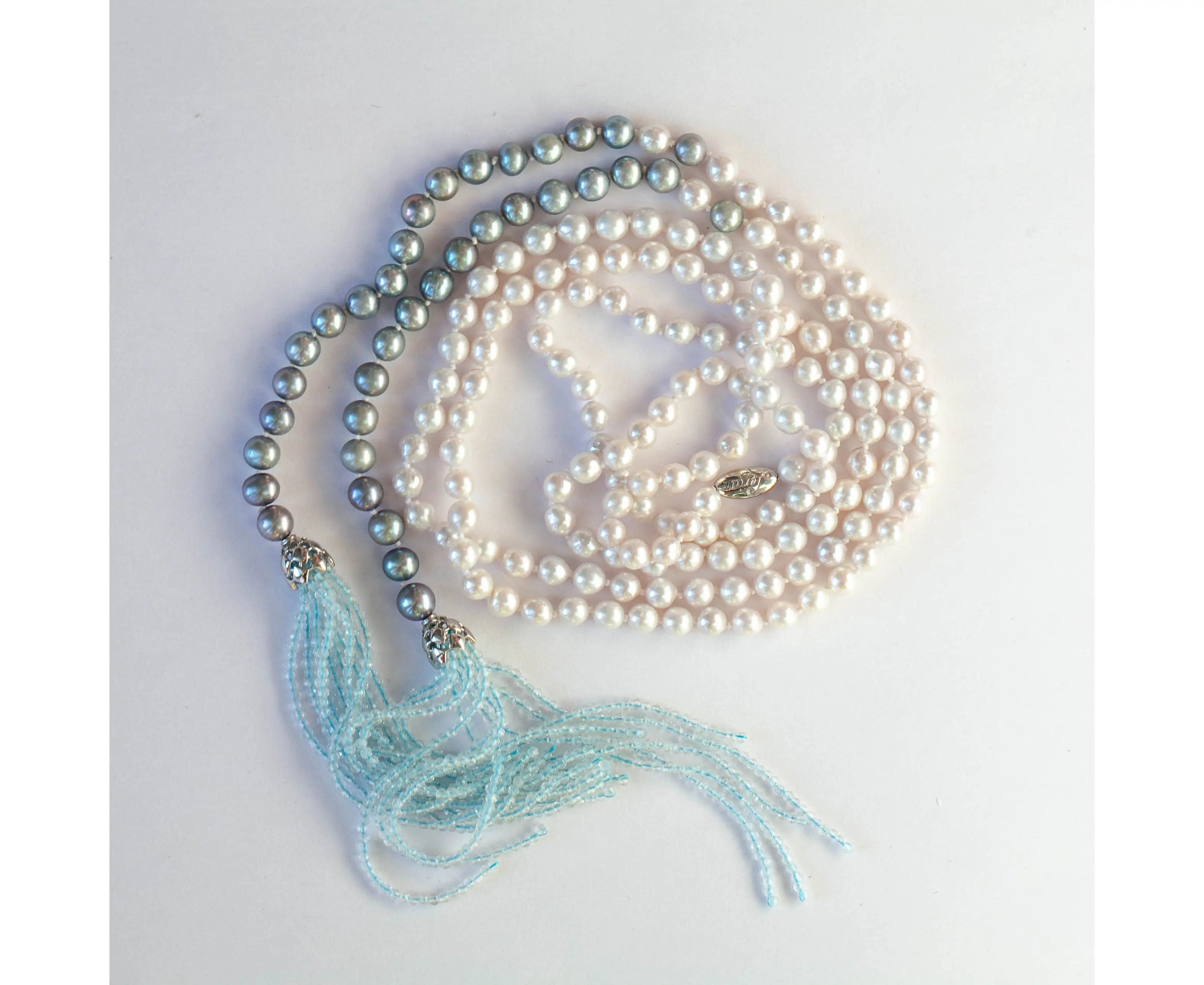 Лариат в серебре с бело-голубым градиентом из жемчуга 5 мм с кистями из топаза (пр.жемчуг d 5 мм, топаз 2 мм, Ag 925 - 2, 25 гр)