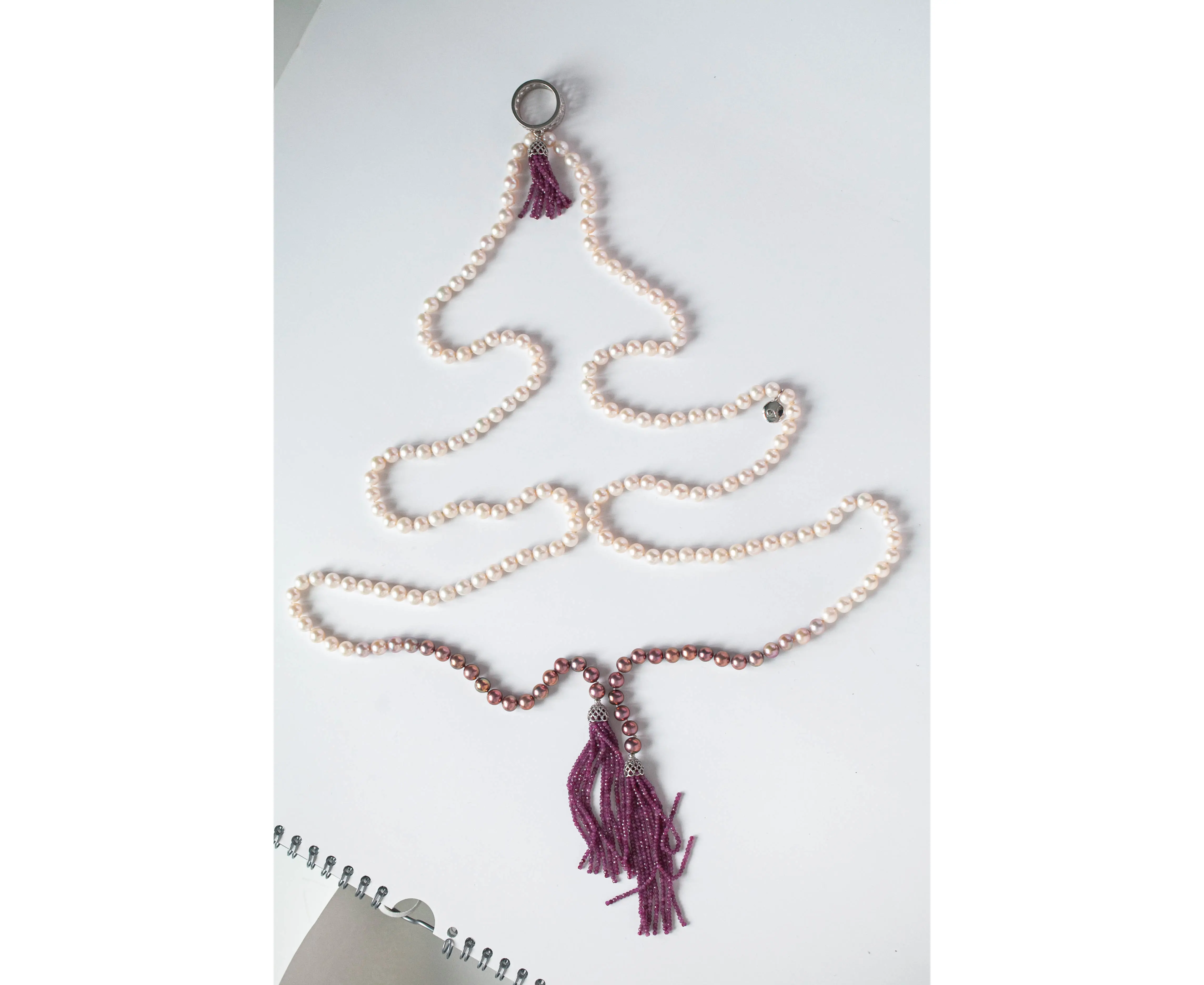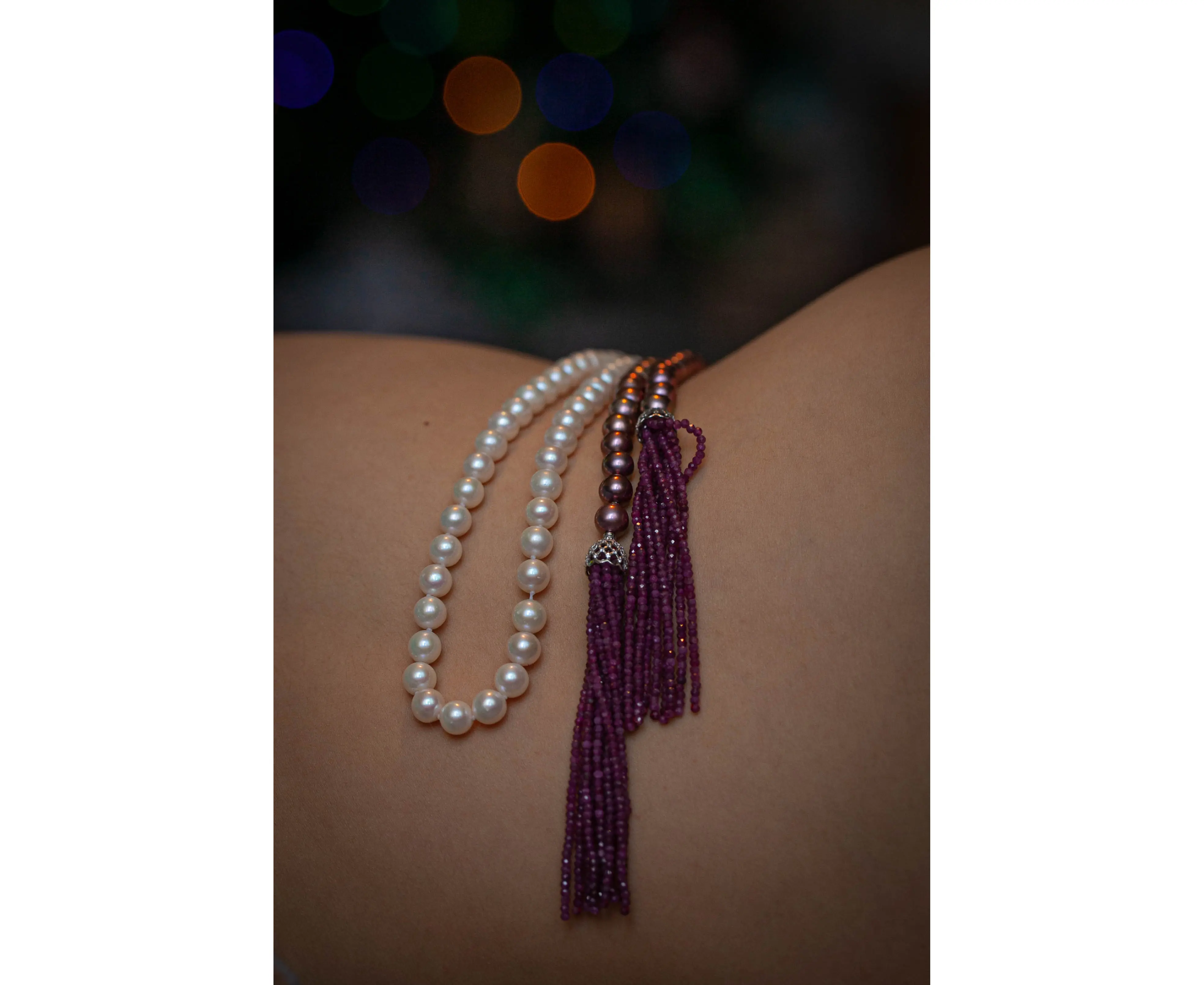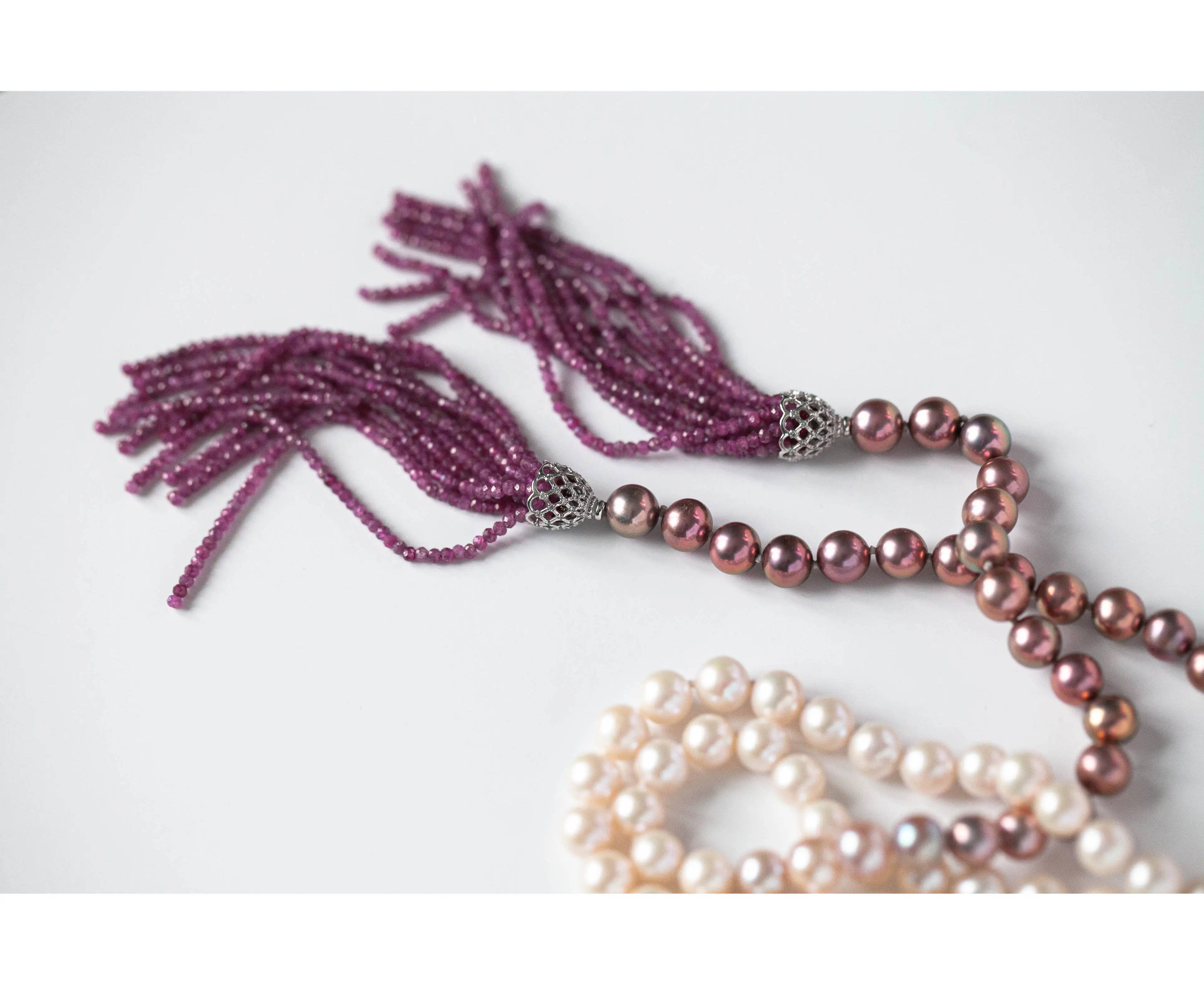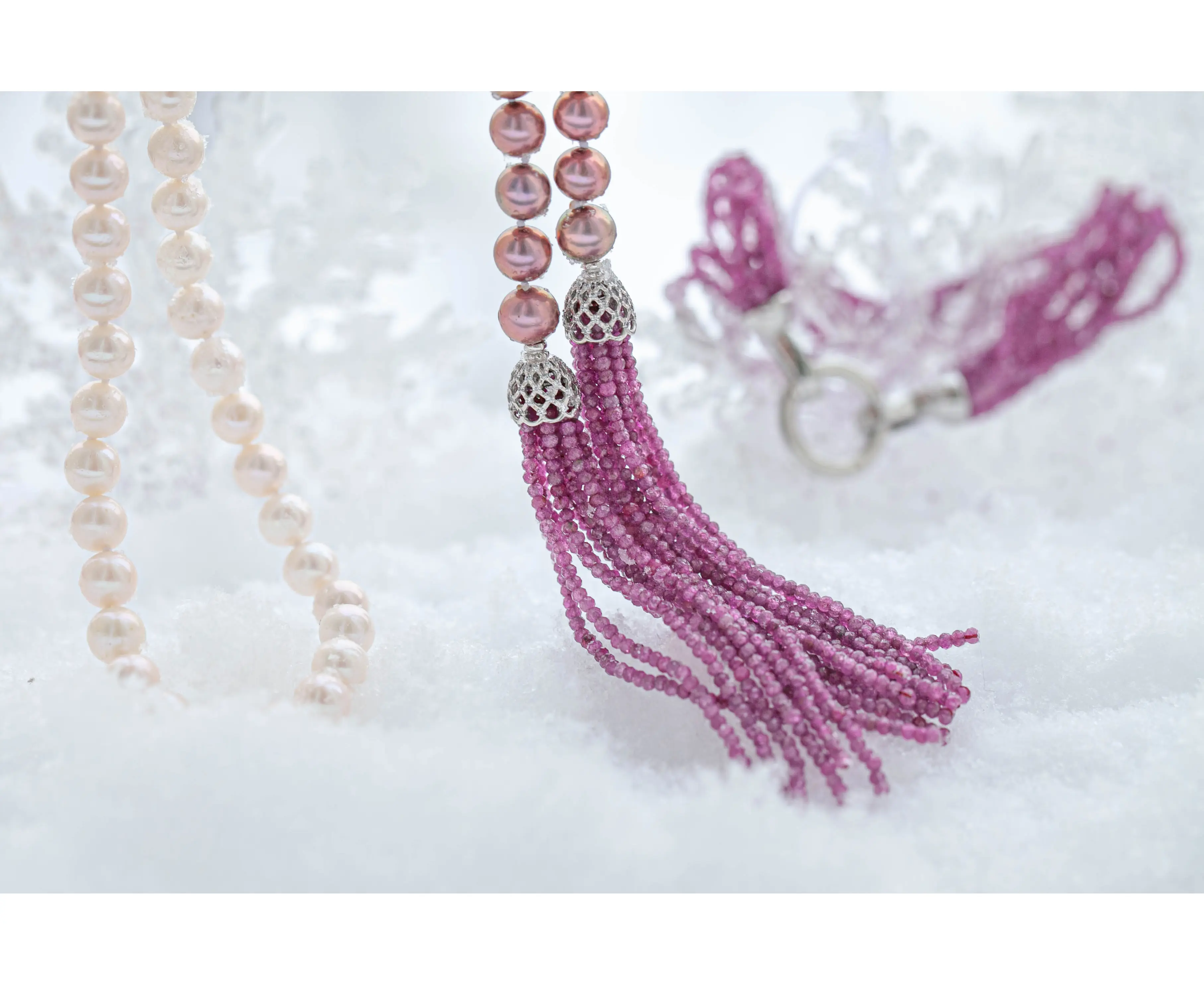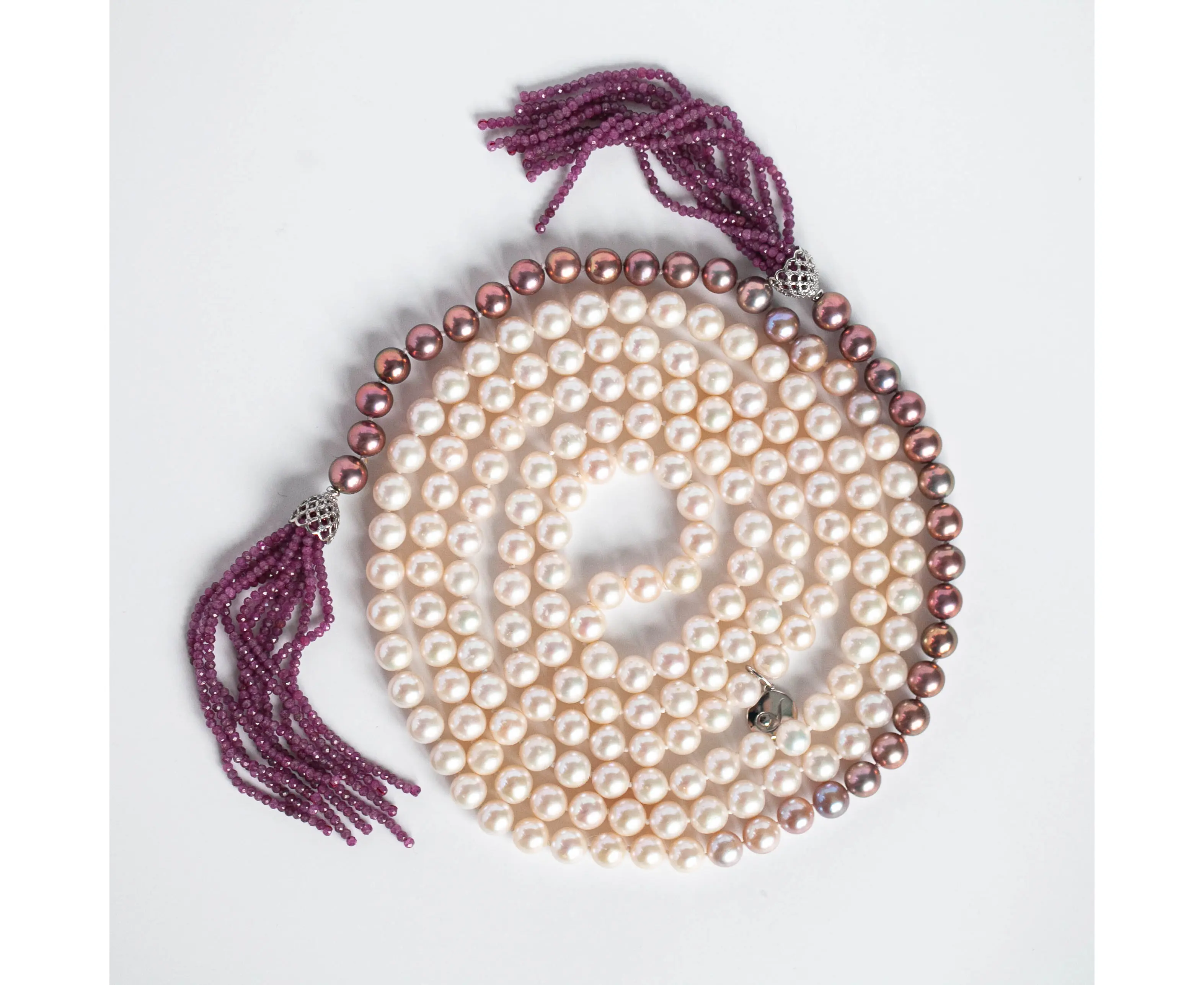 Лариат в белом золоте с розовым градиентом из жемчуга 7мм с кистями из рубина,бесц.сапфиры