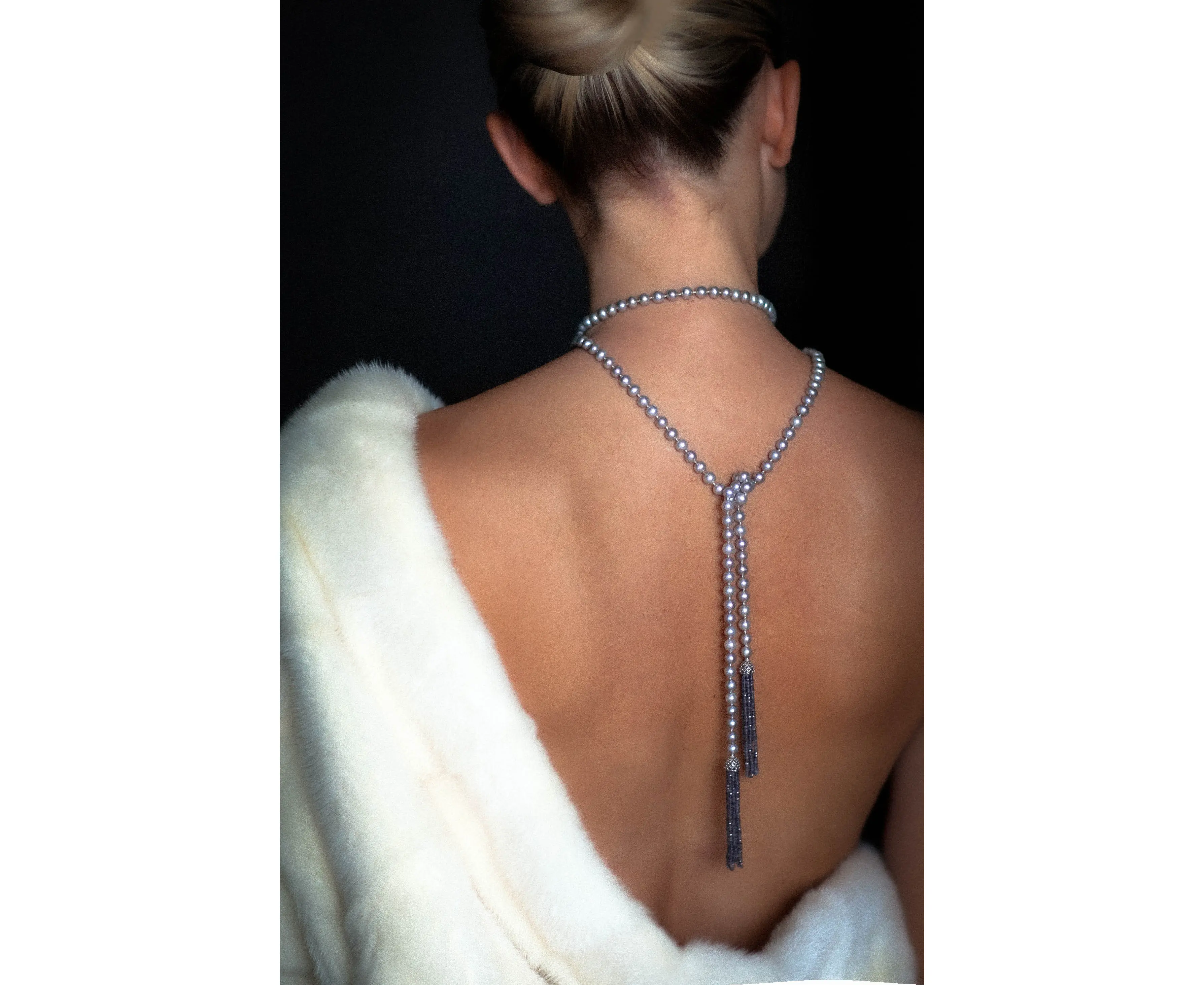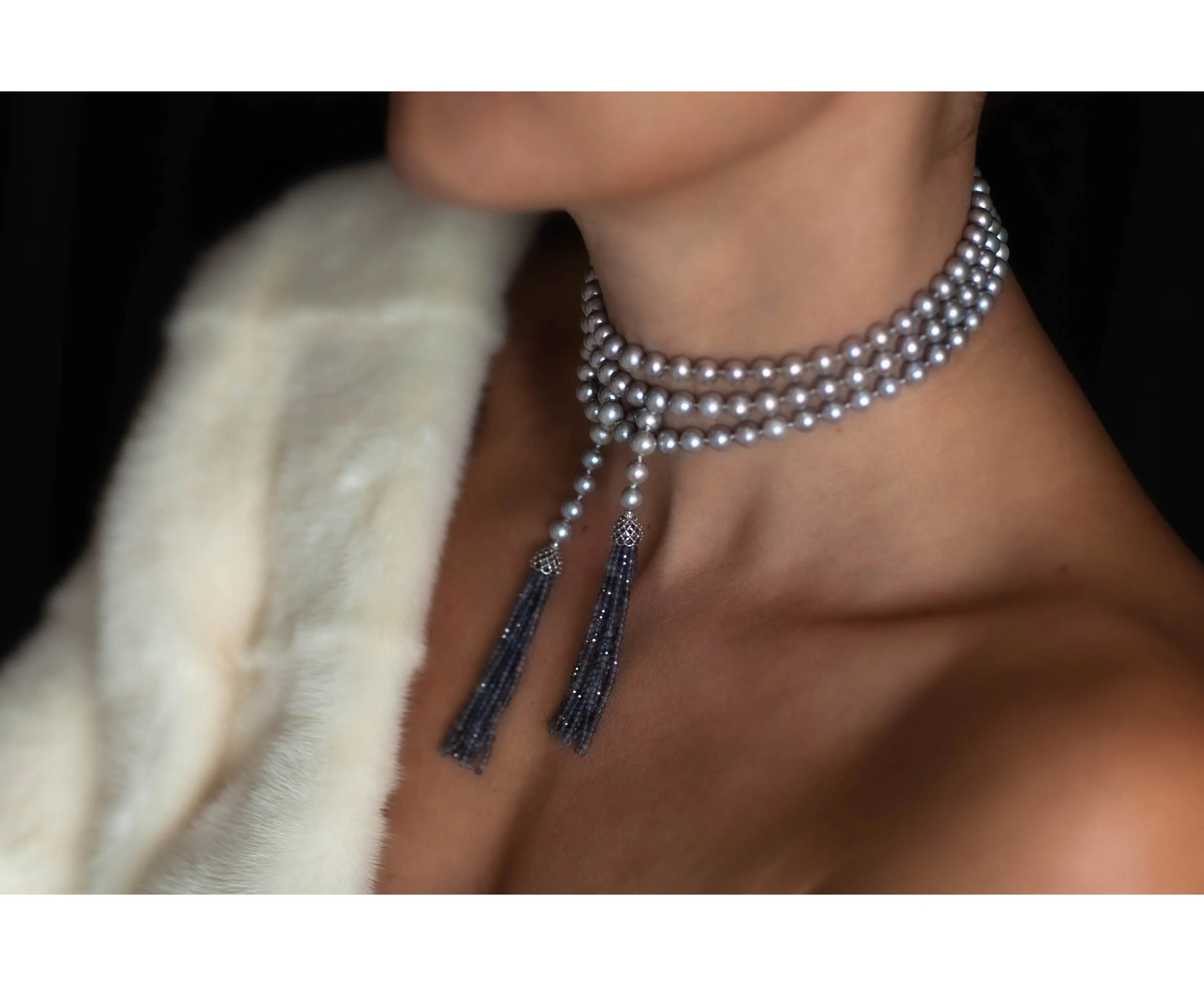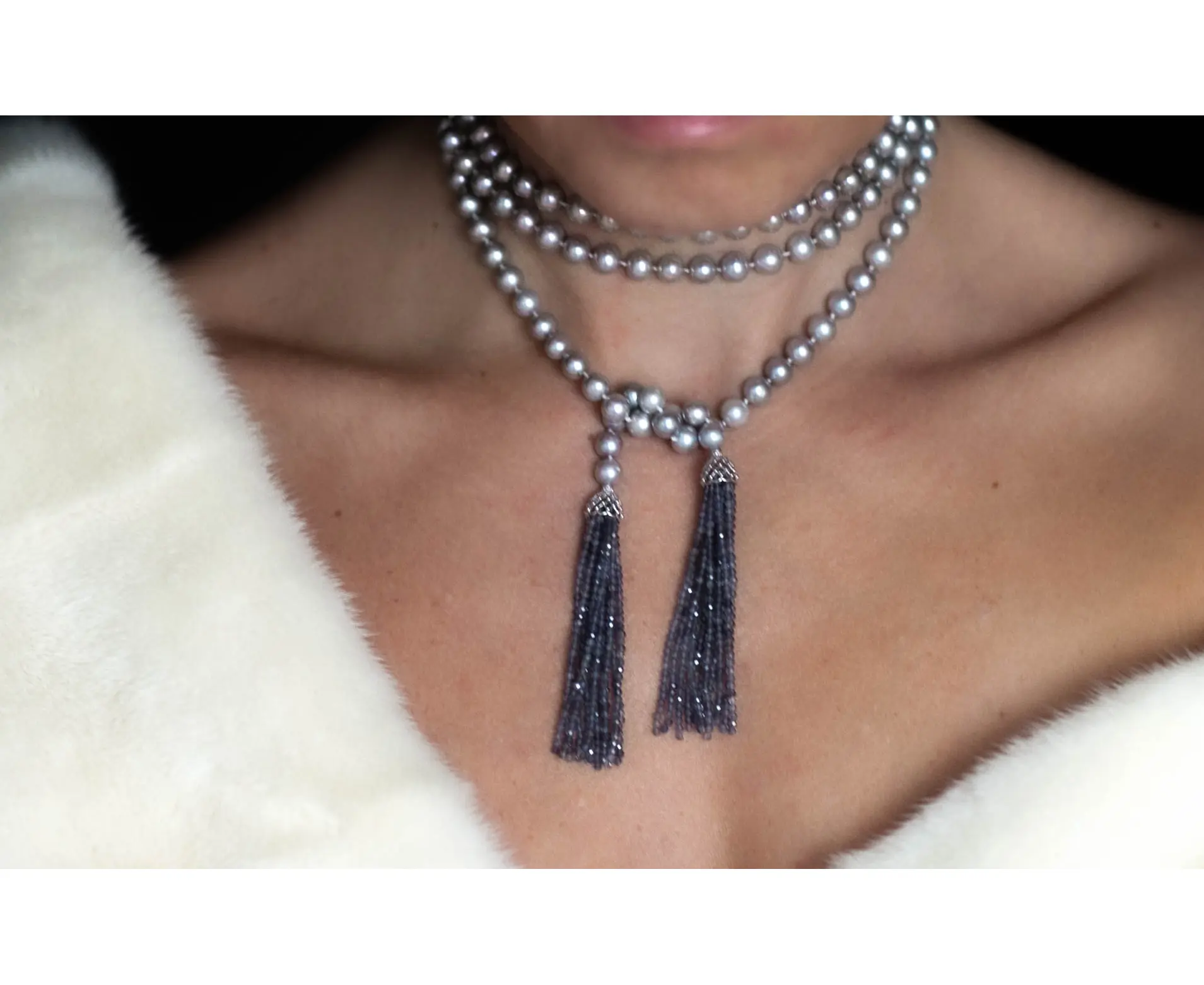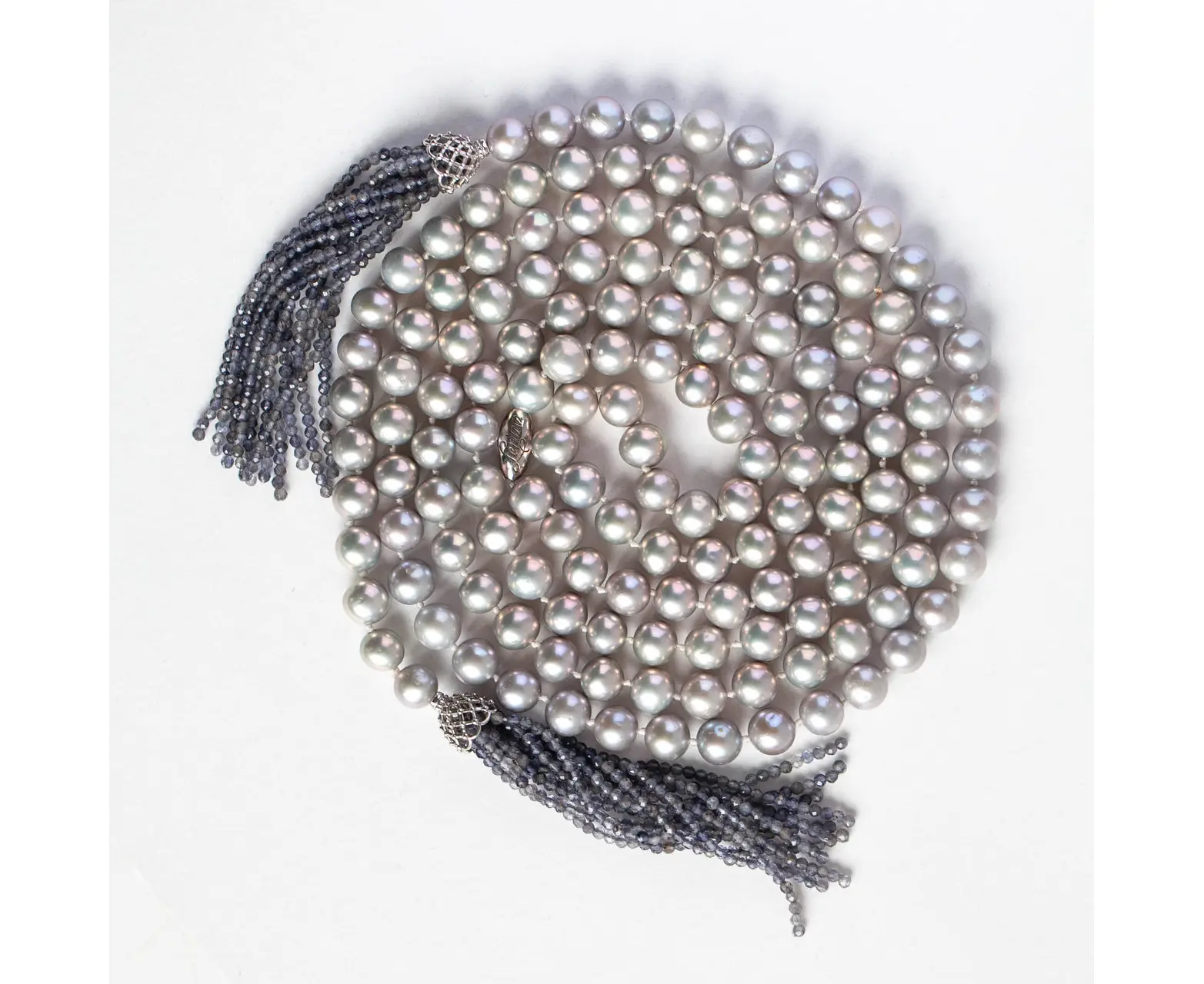 Лариат серый с кистями из иолита (Ag 925) (Жемчуг 6-7 мм, Иолит 2 мм, Ag 925 2.43 гр)