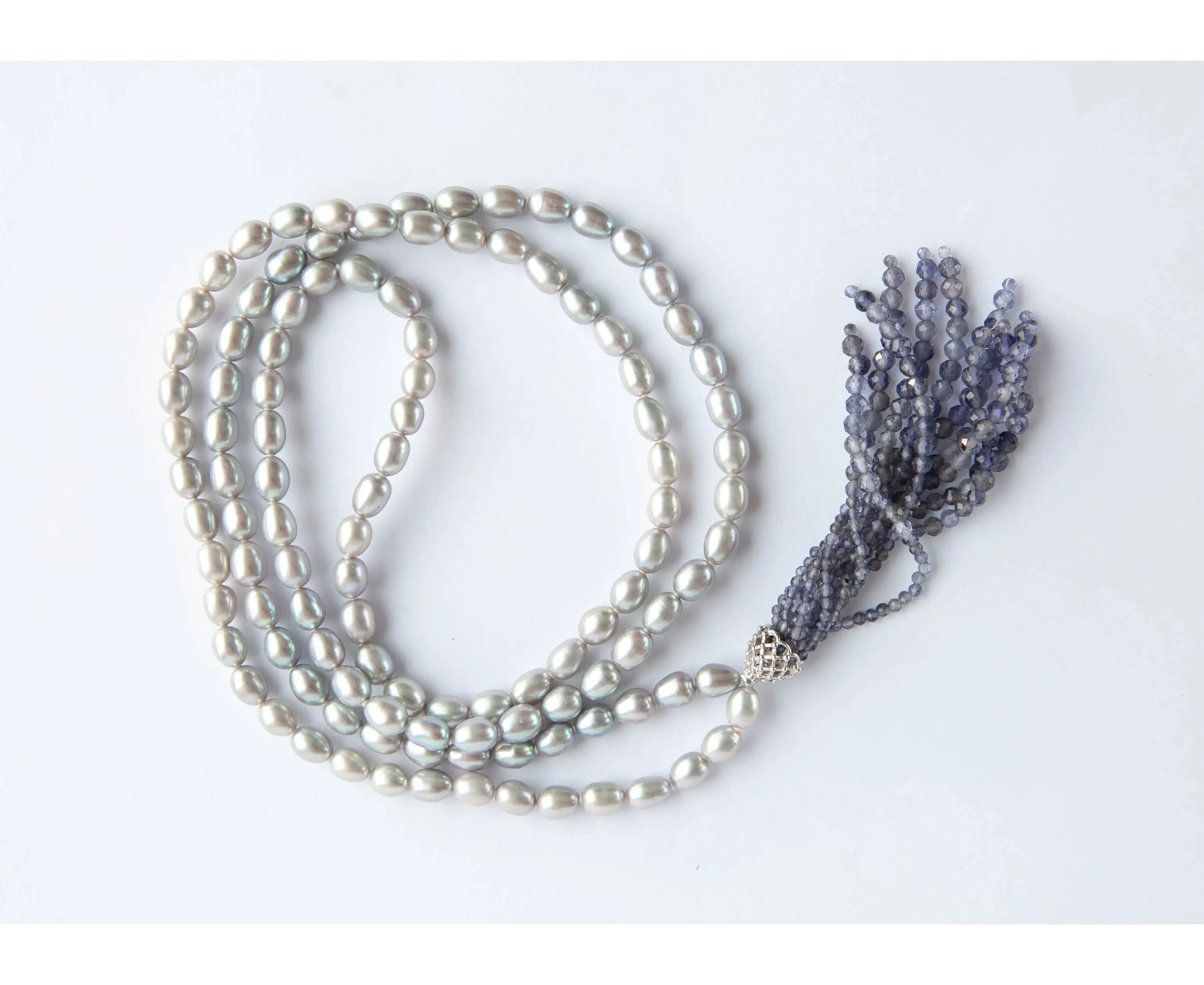 Сотуар в серебре LL из жемчуга серый рис с кистью из иолита (пр. жемчуг рис 5х6 мм, иолит юв.огранки 2, 3, 4 мм, Ag 0,74 гр)