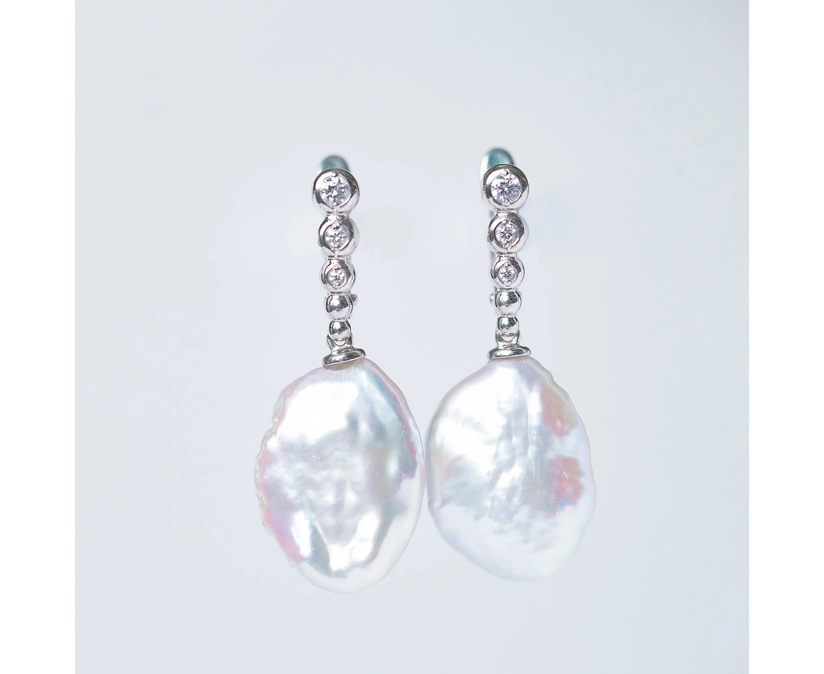 Серьги Бэлла с бриллиантами и жемчугом барочным 14х29 мм белым, золото (Жемчуг барочный 14х29 мм, 6 Бр.кр. 57гр 3/5 0,166 сt, Au - 2.92 гр)