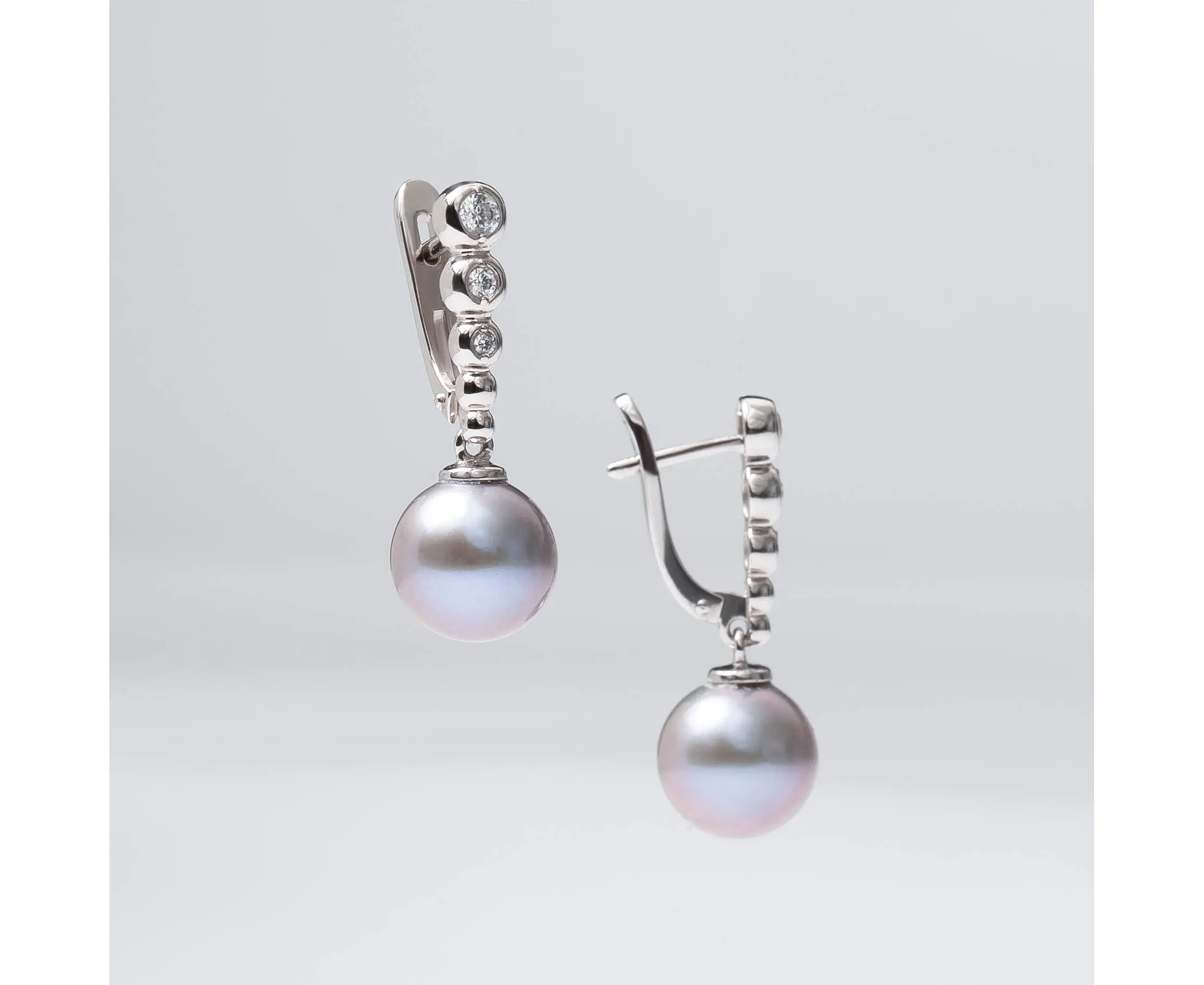 Серьги Бэлла в белом золоте с бриллиантами и жемчугом шар 10,2 мм серым (пр.жемчуг 10,2 мм, 6 Бр.кр. 57гр 3/5 0,166 сt, Au - 2.94 гр)