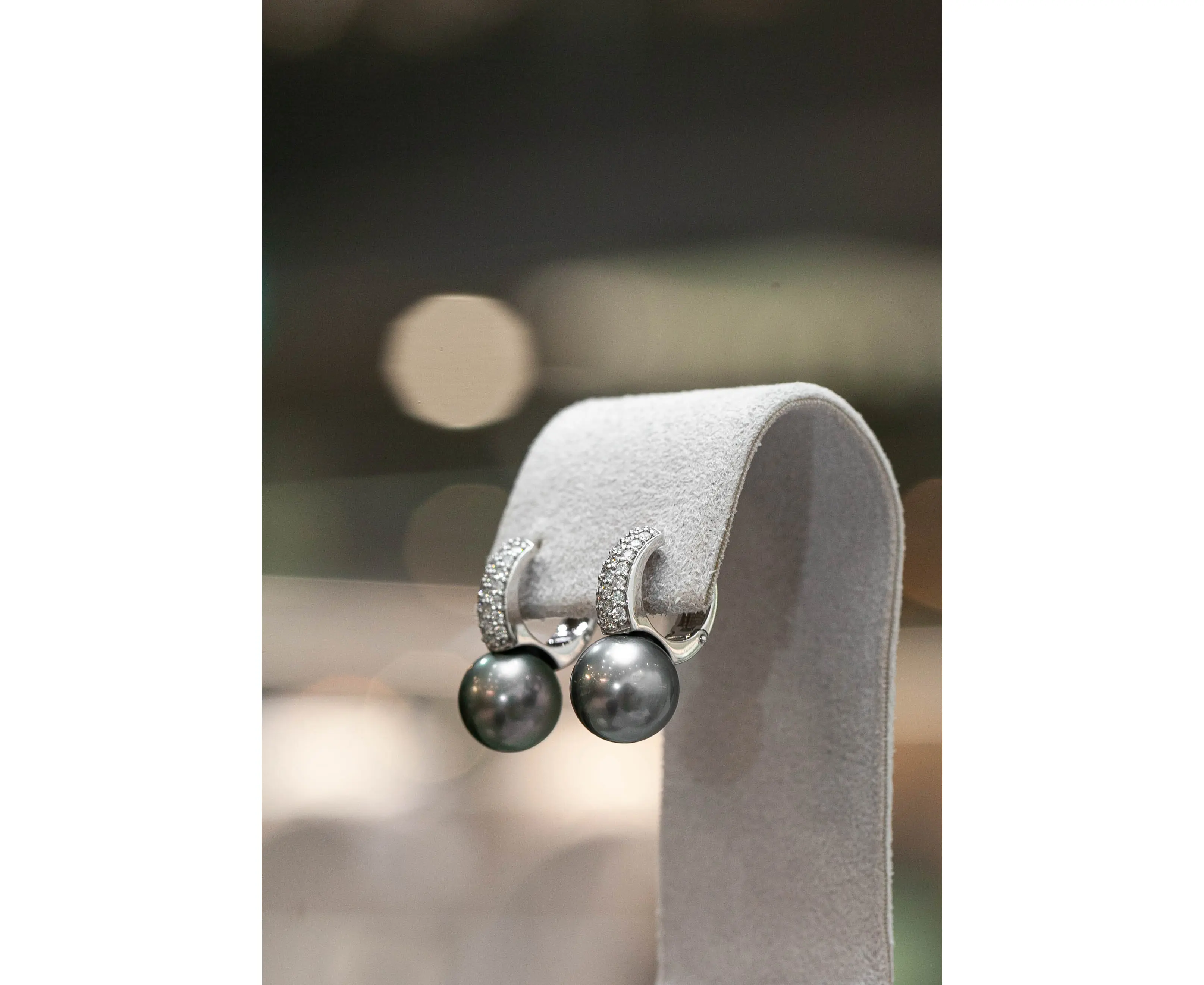 Серьги Грейс в белом золоте, с жемчугом Таити d 11-12 мм, с бесцв.сапфирами , (ЖмчМ 3,770 ,44 Сапф)