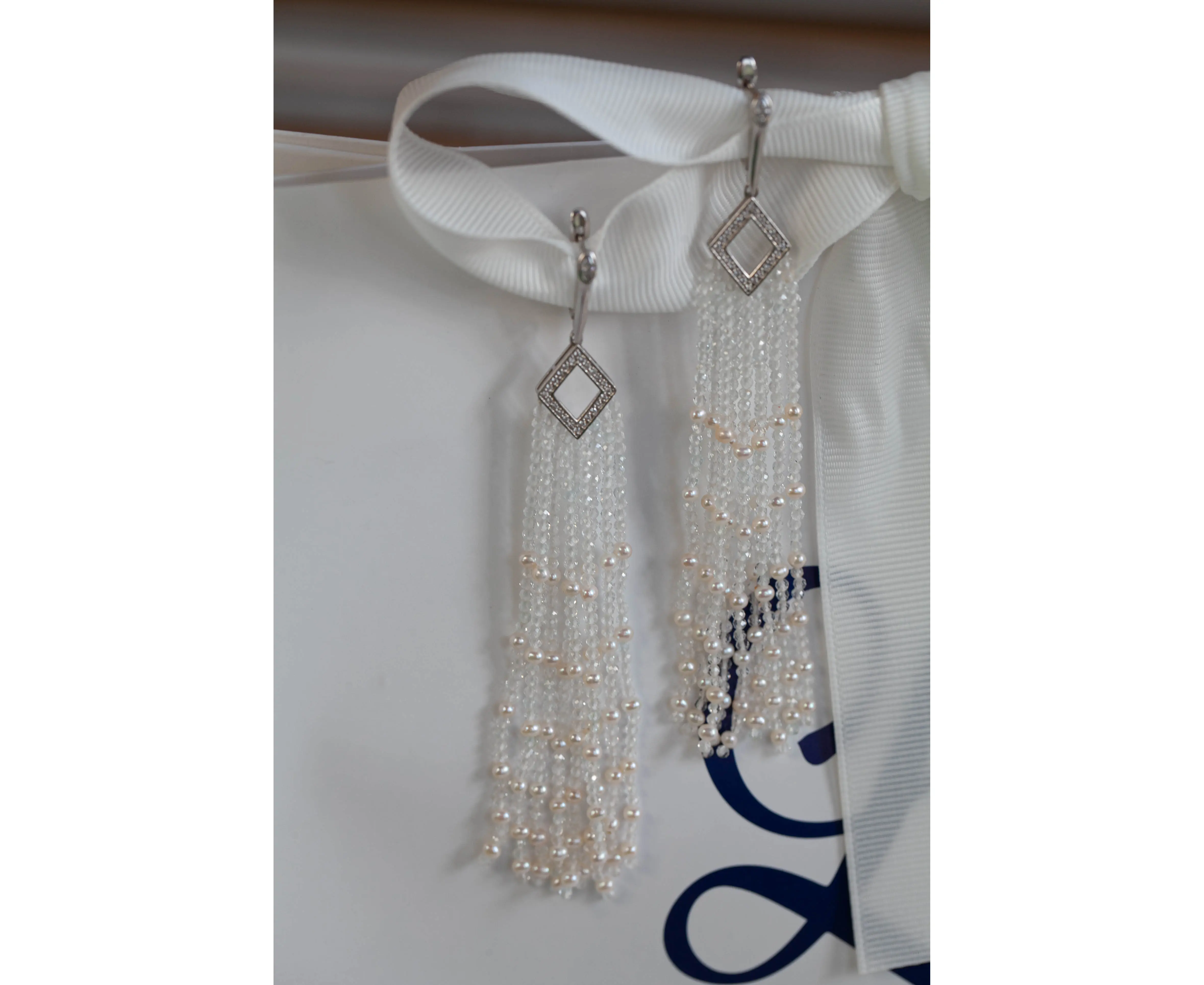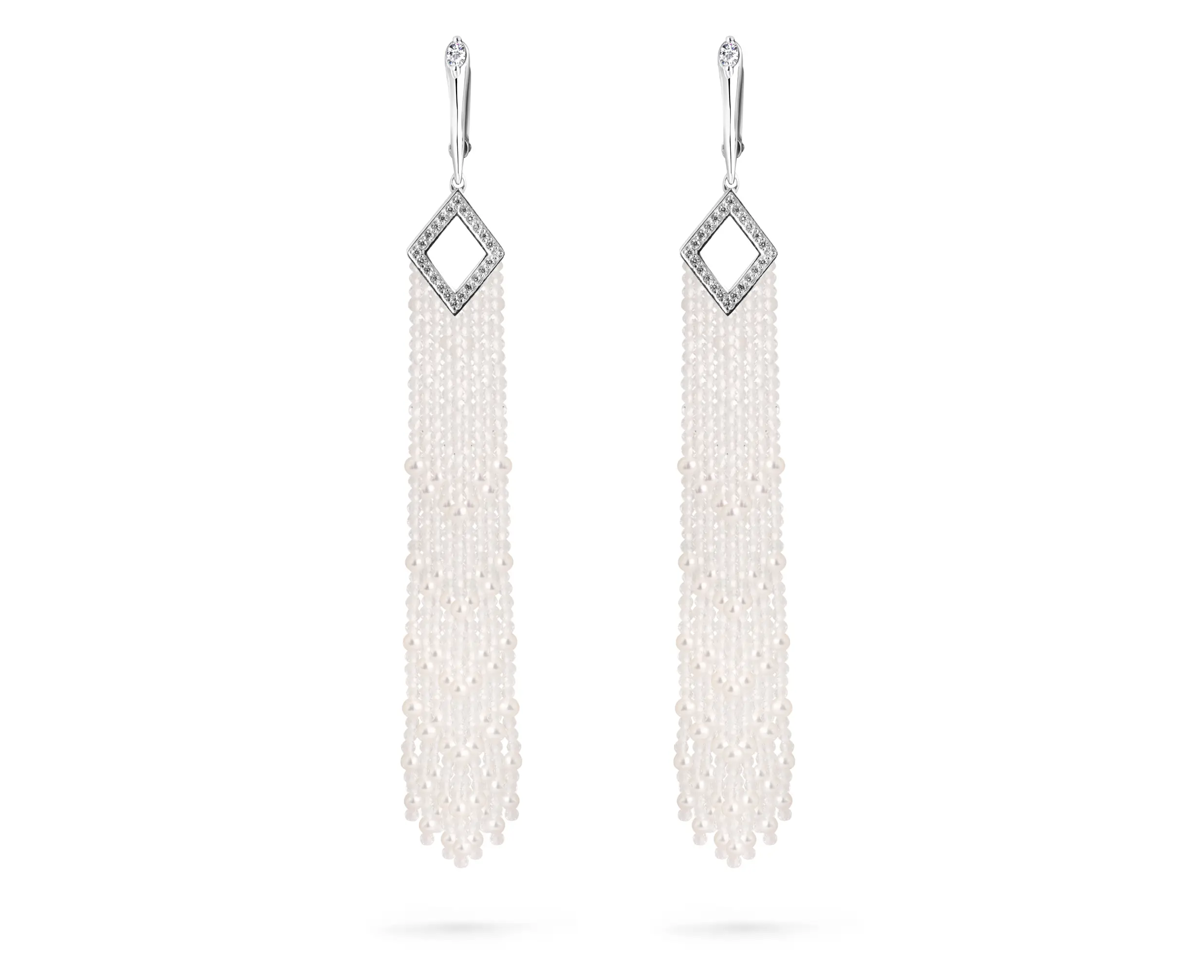 Серьги-кисти ромб в серебре из белого топаза ювелирной огранки и пресноводного жемчуга d 4 мм (Топаз 2мм, Жемчуг 3 мм, Фианит)