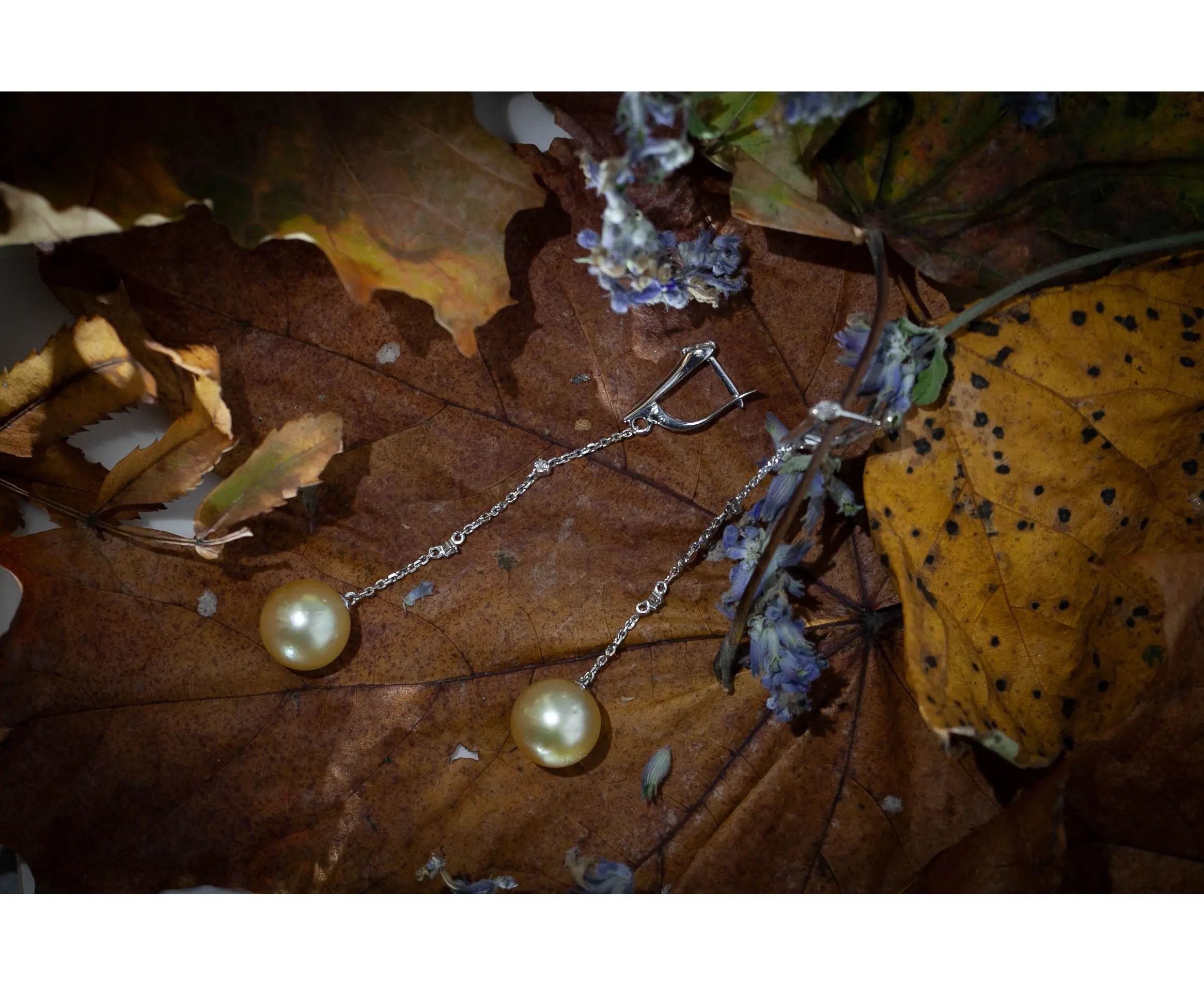 Серьги на цепочках в белом золоте с бриллиантами с золотыми морскими жемчужинами 13 мм