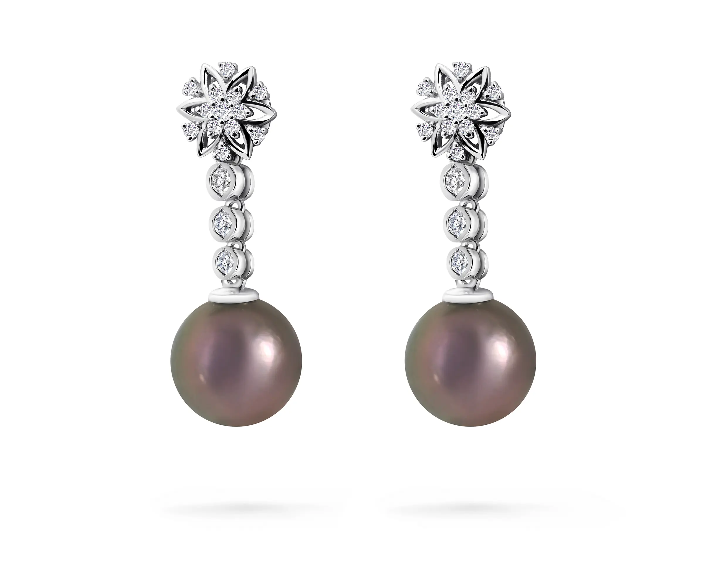 Серьги 3 касты жемчуг Таити 9,4 мм, золото белое, бесцв.сапфиры (жемчуг Таити 9,4 мм - 2; 32 бесцв.сапфира 0,282 ct, Au - 3,12 гр)