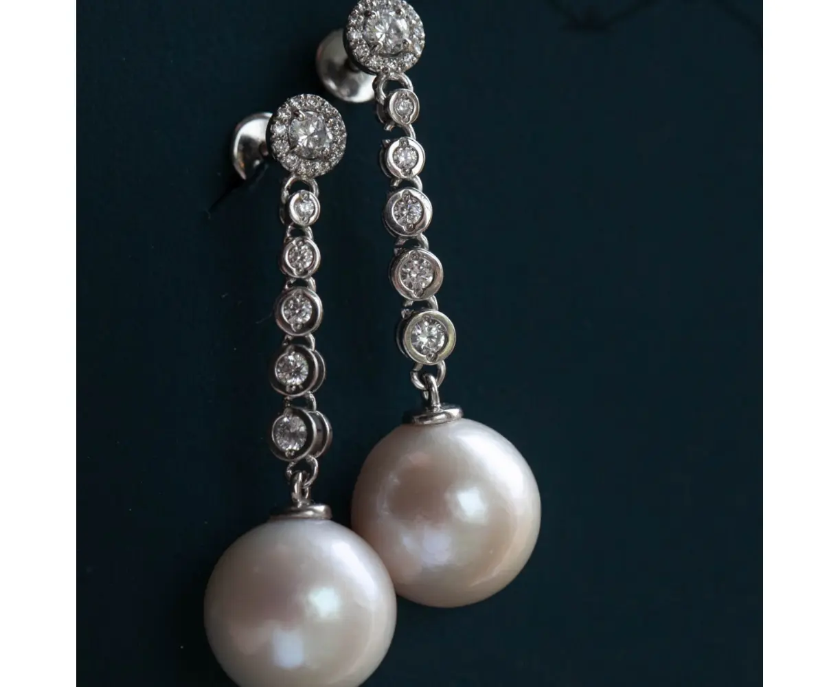 Серьги в белом золоте с бесцветными сапфирами с пятью кастами и морскими жемчужинами 14 мм (ЖмчМ 8,170 ,24 Сапф круг)