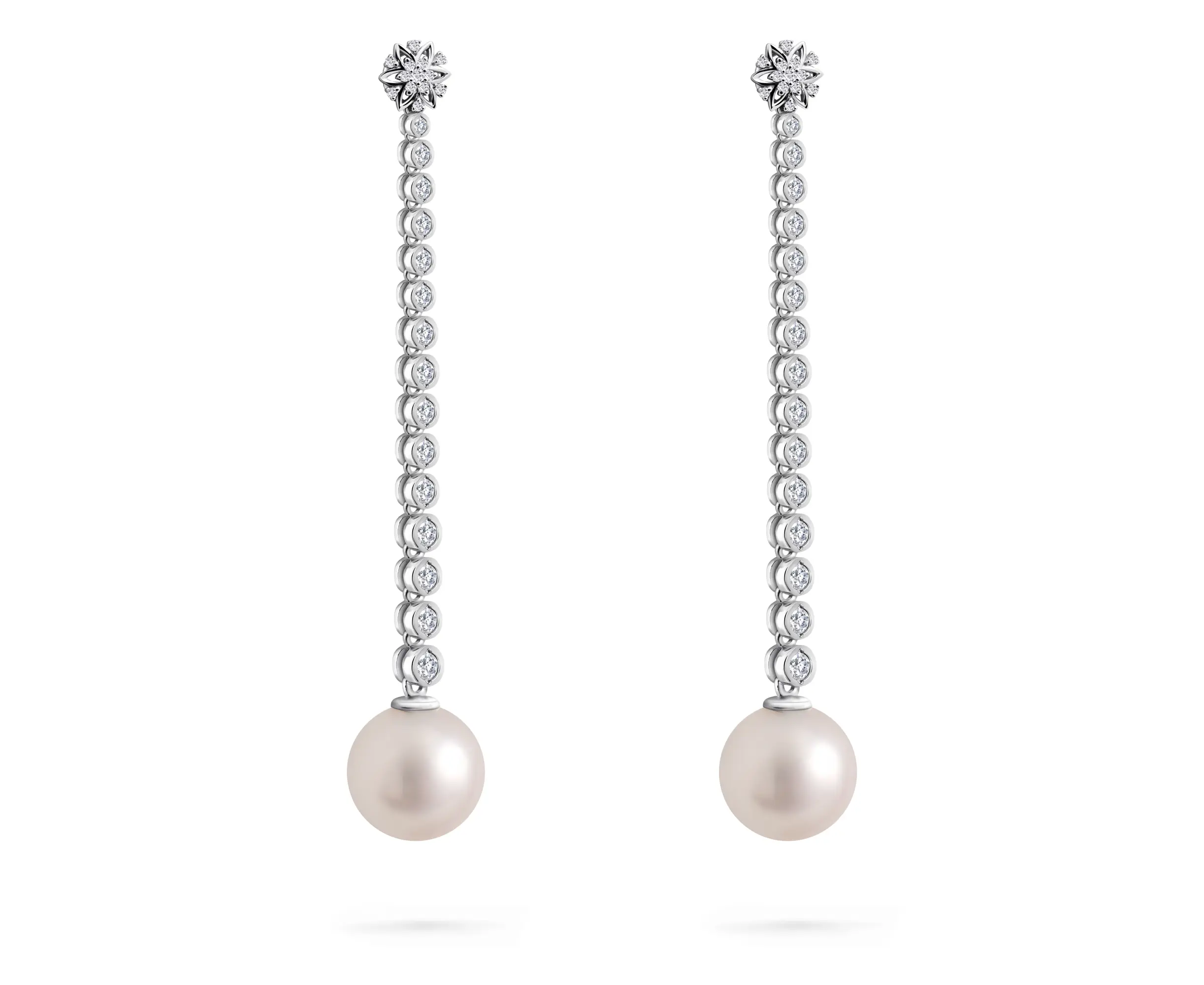Серьги в белом золоте с бриллиантами, звездой и жемчугом 12 мм (Жемчуг пресноводный 11 -2; Бриллианты кр.57 3/5 2.25-8, 2.0-6, 1.75-6, 1.5-8, 1.25-4, 1.0-24, 0,85 ct, Au 6,22 гр)