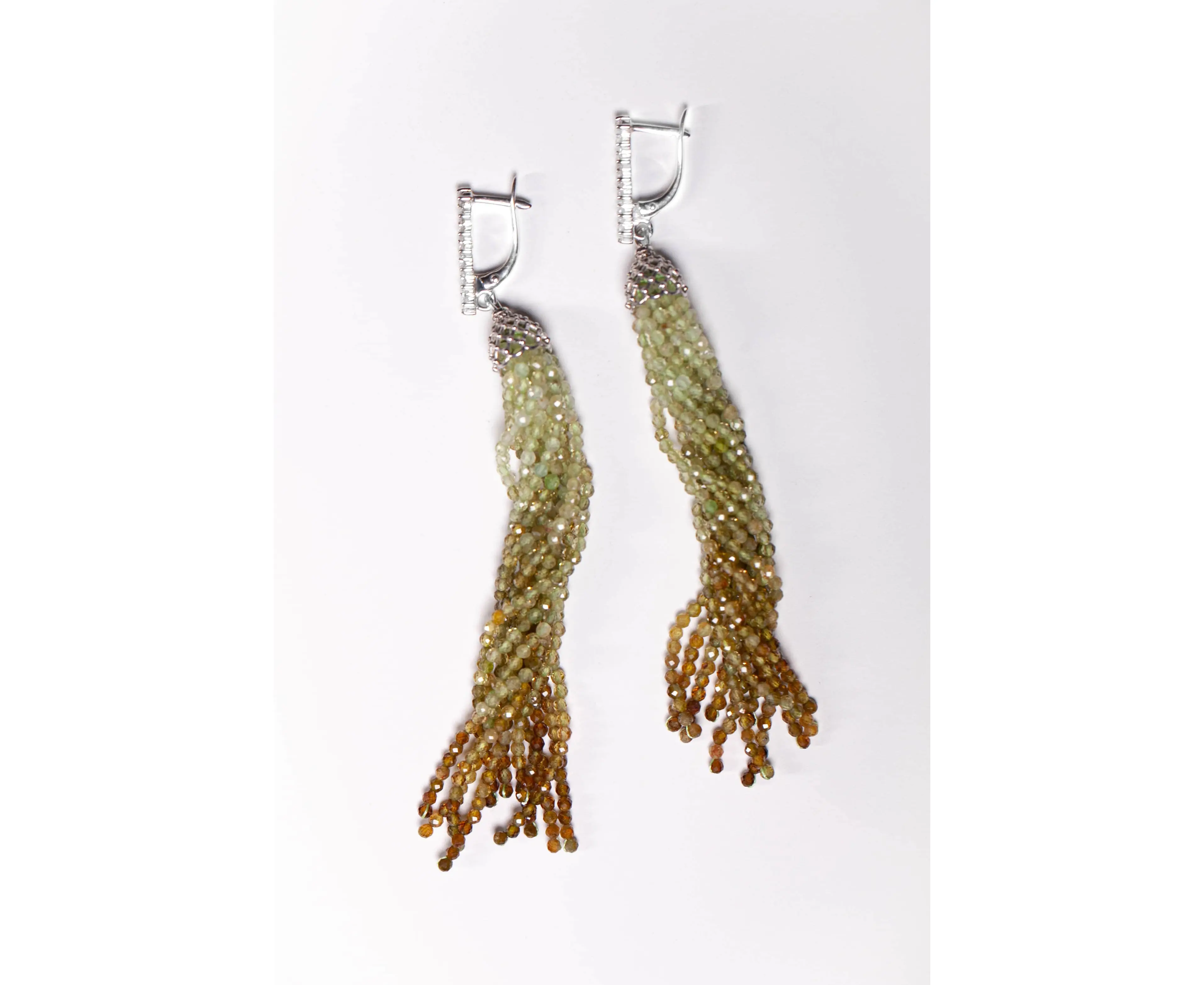Серьги-кисти из зеленого граната ювелирной огранки (зеленый гранат 2мм. 2 фианит маркиз 2,0, Ag - 3,4 гр)