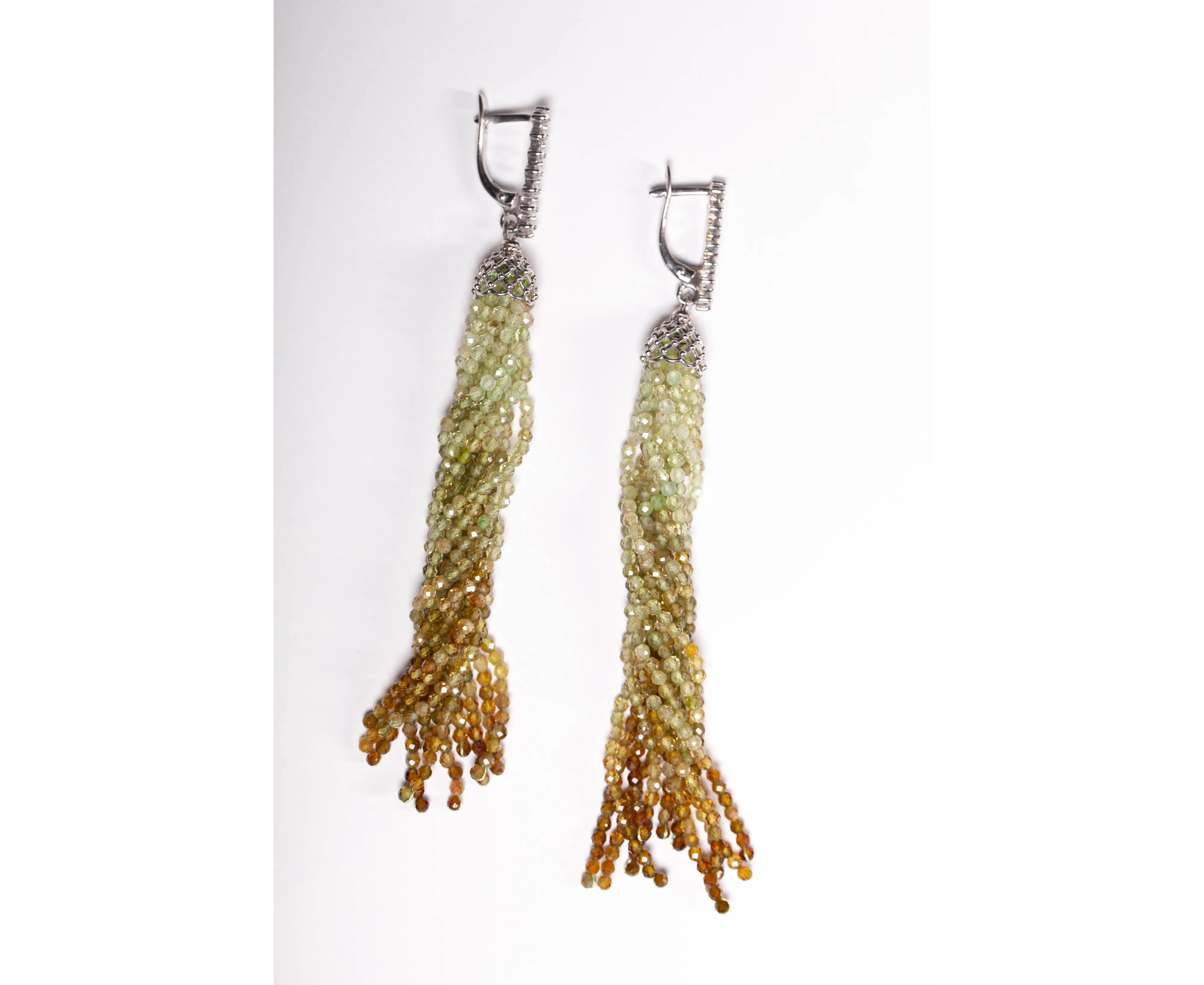 Серьги-кисти в серебре из зеленого граната ювелирной огранки короткие (зеленый гранат 2мм. 2 фианит маркиз 2,0, Ag - 3,4 гр)